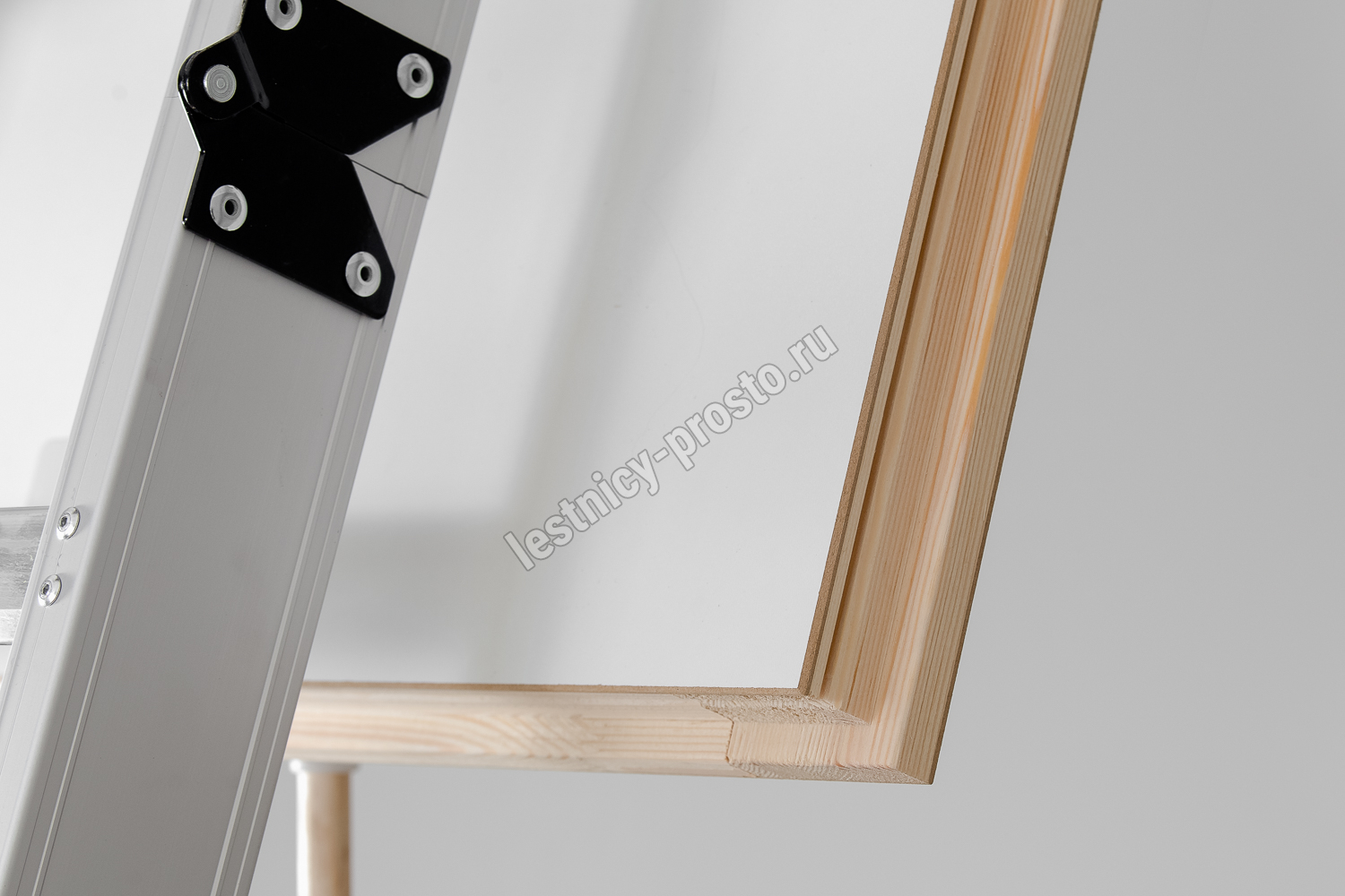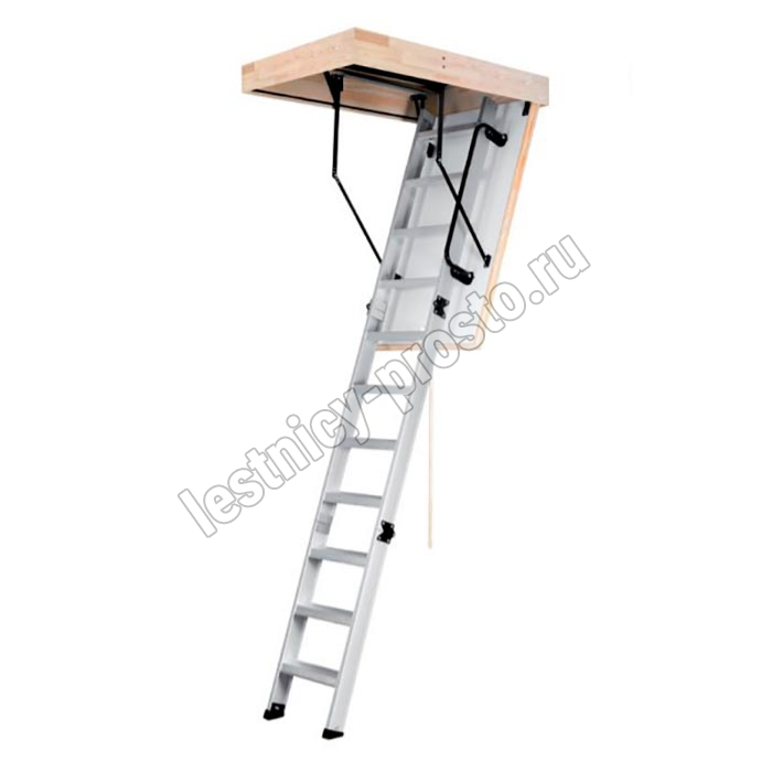 Складная 4-х секционная чердачная лестница. Рабочая поверхность полностью выполнена из алюминия. Термоизоляционная крышка типа "сэндвич" имеет усиленную теплозащиту, облицована с двух сторон ДВП белого цвета. По контуру короба имеется уплотнитель; Все металлические элементы лестницы покрыты порошковой краской.