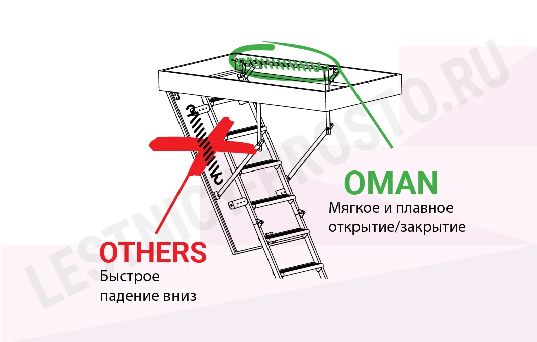 Все элементы лестницы выполнены из экологически чистых материалов и обработаны веществами, не содержащими тяжелых металлов. На ступенях антискользящие насечки. Короб лестницы изготовлен из металла. Термоизоляционная крышка типа "сэндвич" утеплена пенопластом, облицована с двух сторон ДСП белого цвета. Короб люка с уплотнителем. В комплекте деревянный стержень для открывания лестницы.