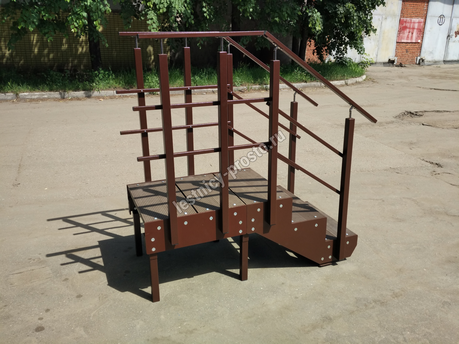 Ступени лестницы состоят из металлической рамки, обеспечивающей необходимую прочность, и покрытия из террасной доски ДПК (древесно-полимерный композит). Ступени не боятся воды и мороза, не теряют со временем свой внешний вид и не требуют ухода.
