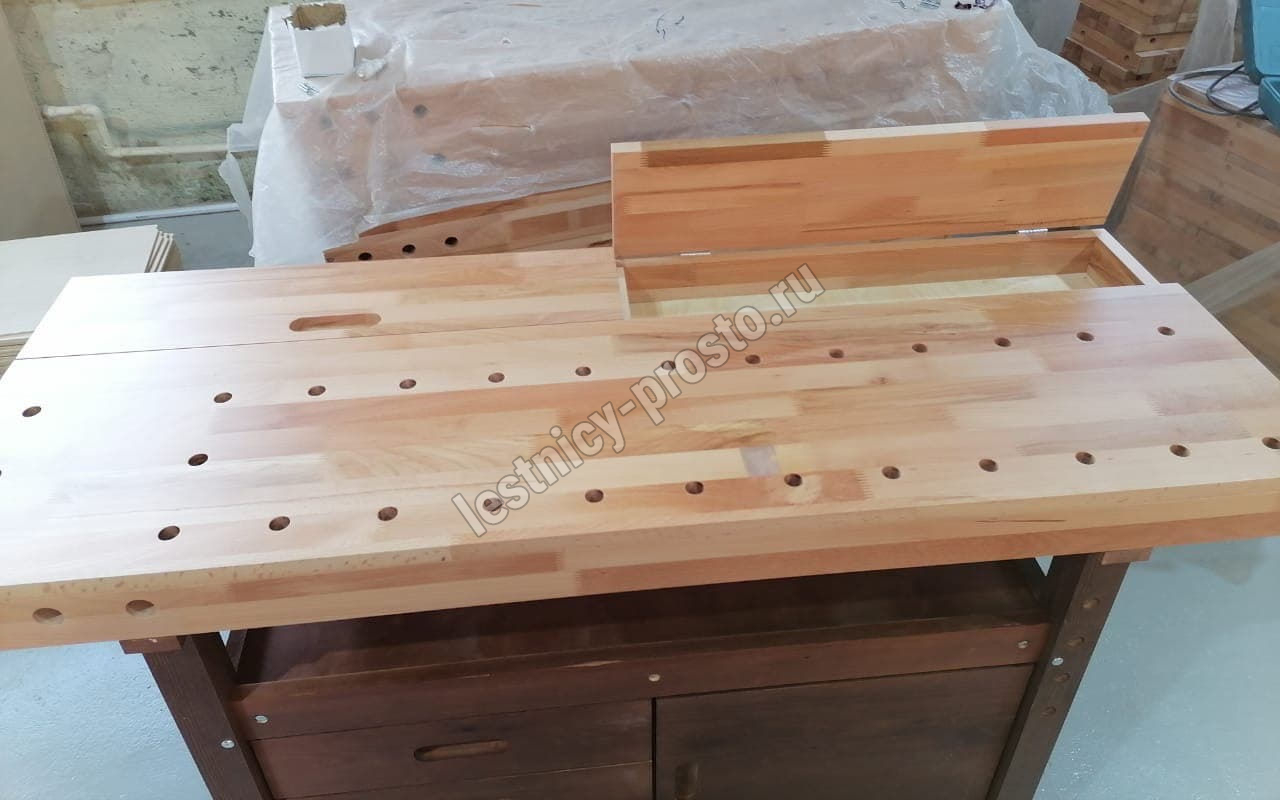 Комплектация: 2 комплекта тисков, 2 пенала в столешнице, 3 ящика, 1 шкафчик, полка.