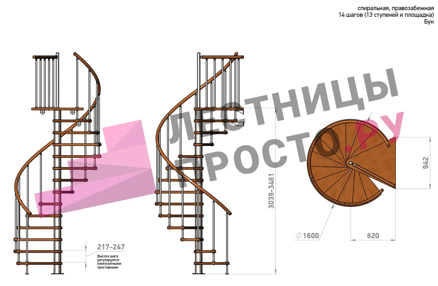 | Винтовая лестница Prosto Spiral Black D140см, h303.9-348,1 см, бук |