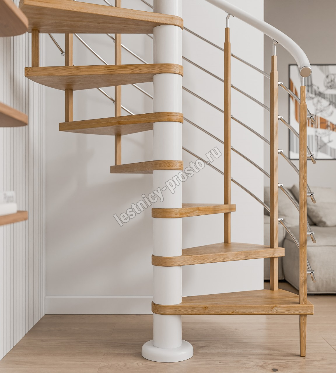 Центральный столб собирается из деревянных цилиндрических модулей (внутри металлическая шпилька), цвет белый.