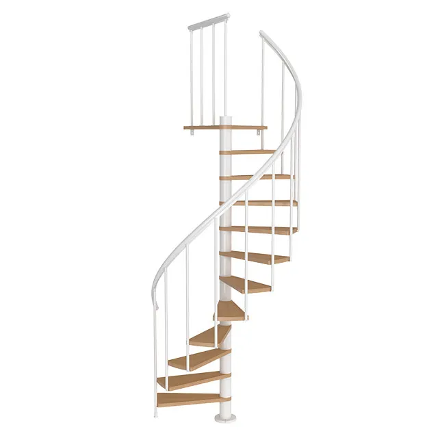 Ступени лестницы изготовлены из бука по технологии MULTIPLEX и покрыты износостойким защитным лаком. Лестница монтируется как по часовой стрелке, так и против. Возможен монтаж в круглый или квадратный проём. Ограждение: стальные трубки, Ø25 мм RAL 9016. Поручень: гибкий цельный ПВХ-поручень Ø40 мм белого цвета. Конструкция и балюстрада окрашены порошковым способом в белый цвет (RAL 9016).